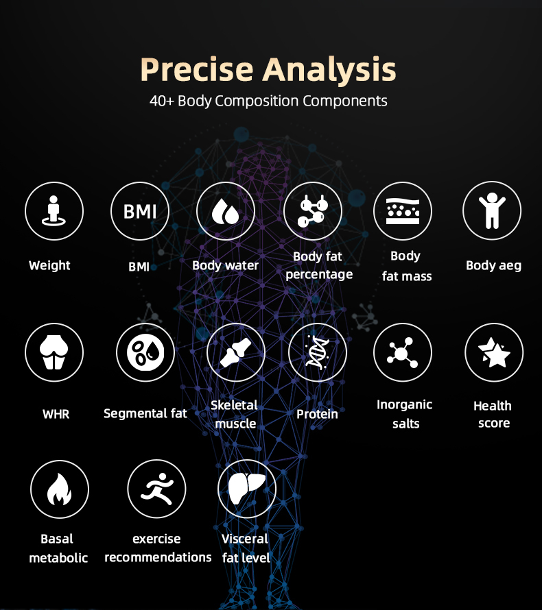 8.8-point contact electrode, multi-frequency bioelectrical impedance (BIA). Indicators: body fat percentage, body water percentage, muscle mass percentage, basal metabolic rate, inorganic salts, etc.